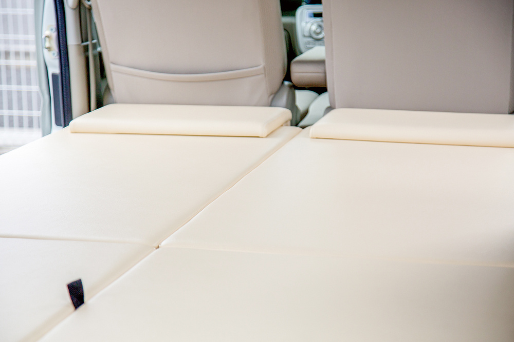倒したリアシートの上に、直接マットを置くだけという市販品が多い中、「ちょいCam」シリーズは、ベッドマット裏に、しっかりとした4本の脚をつけマットを固定しています。